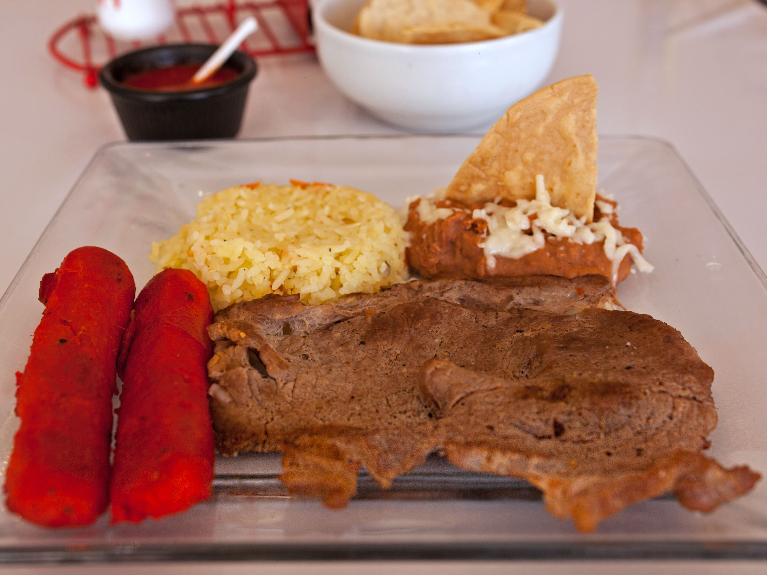 200grs. T Bone, frijoles, arroz salchicha campestre.