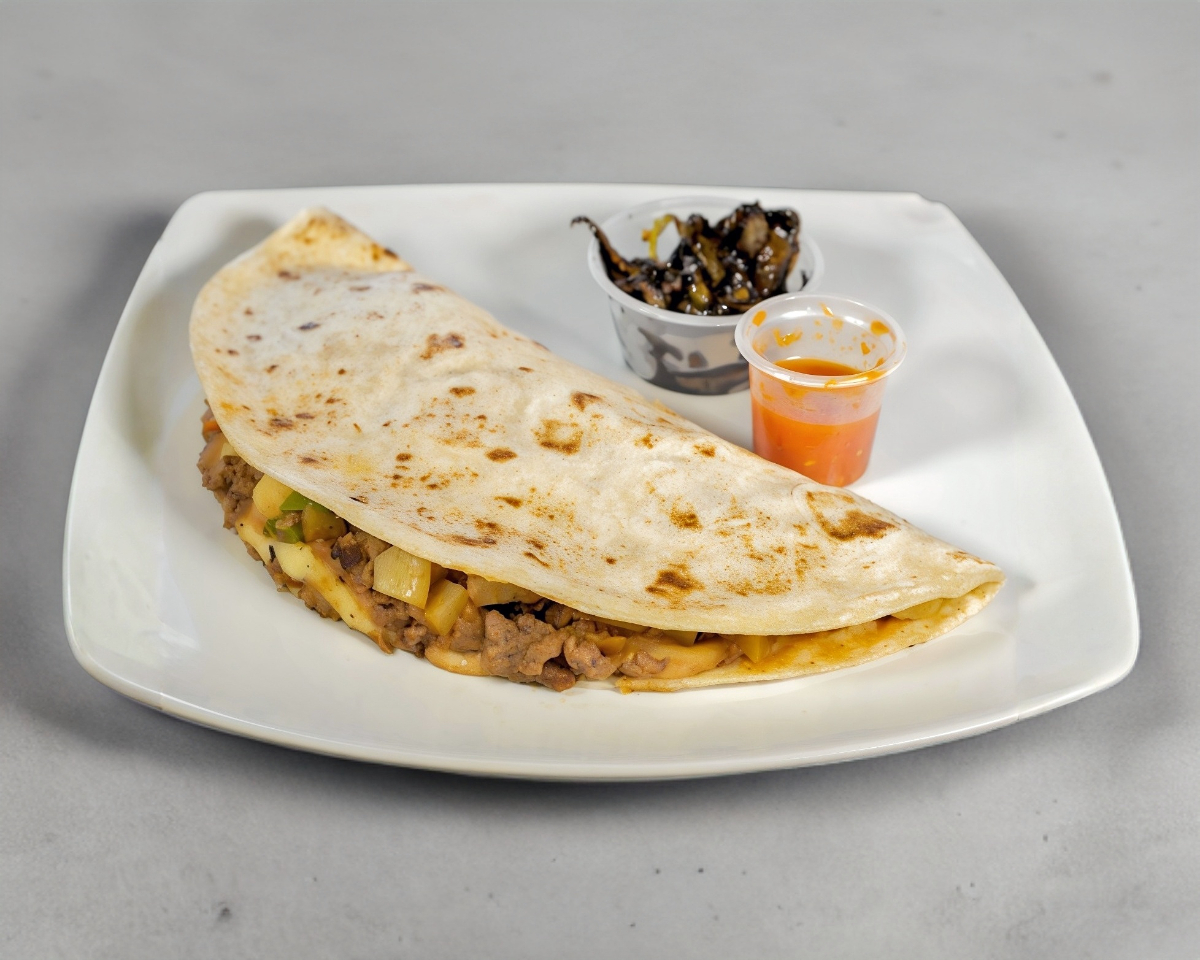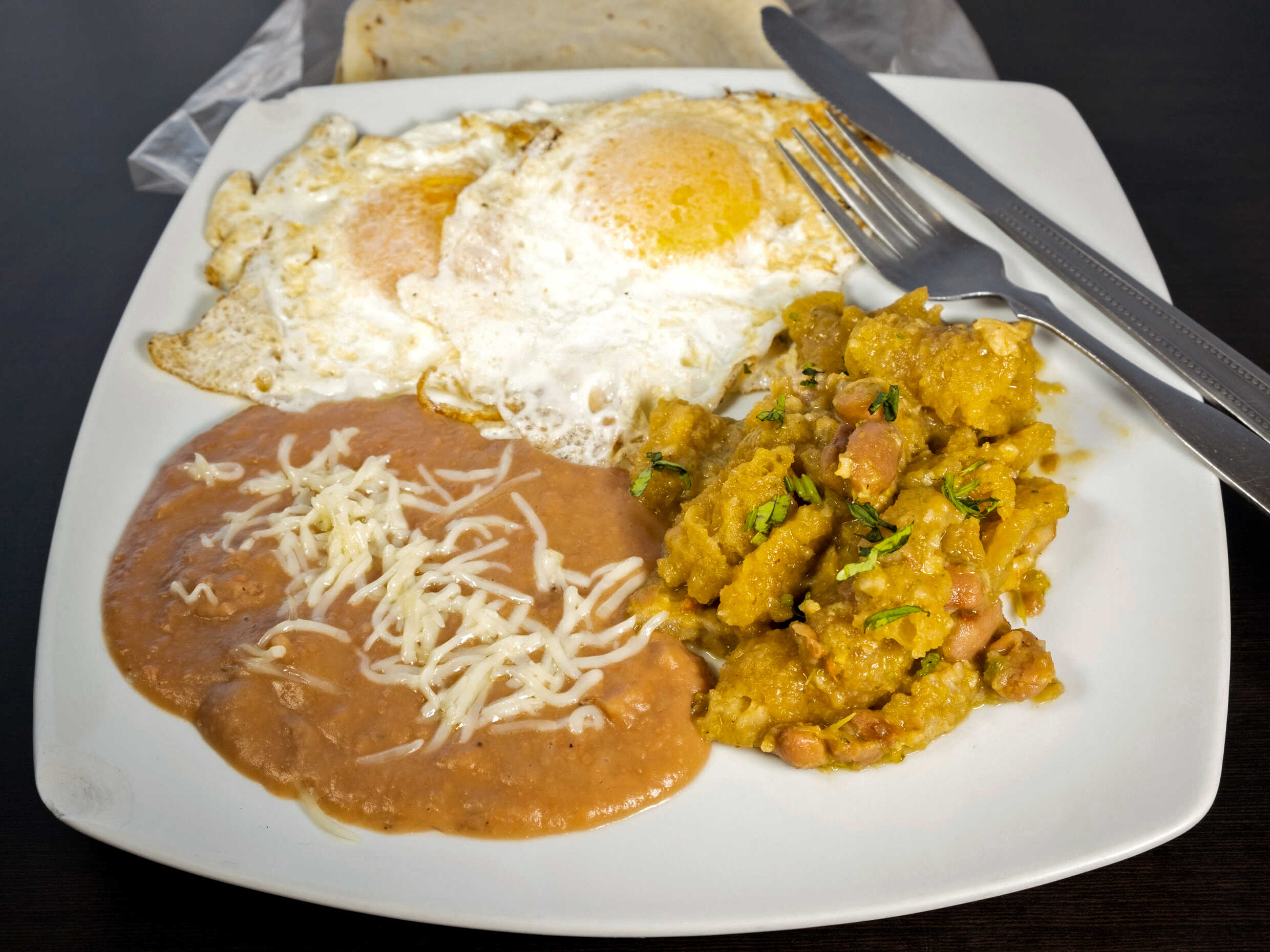 Dos guisos a escoger indicar por mensaje los guisos, frijoles con tortillas de maíz.
