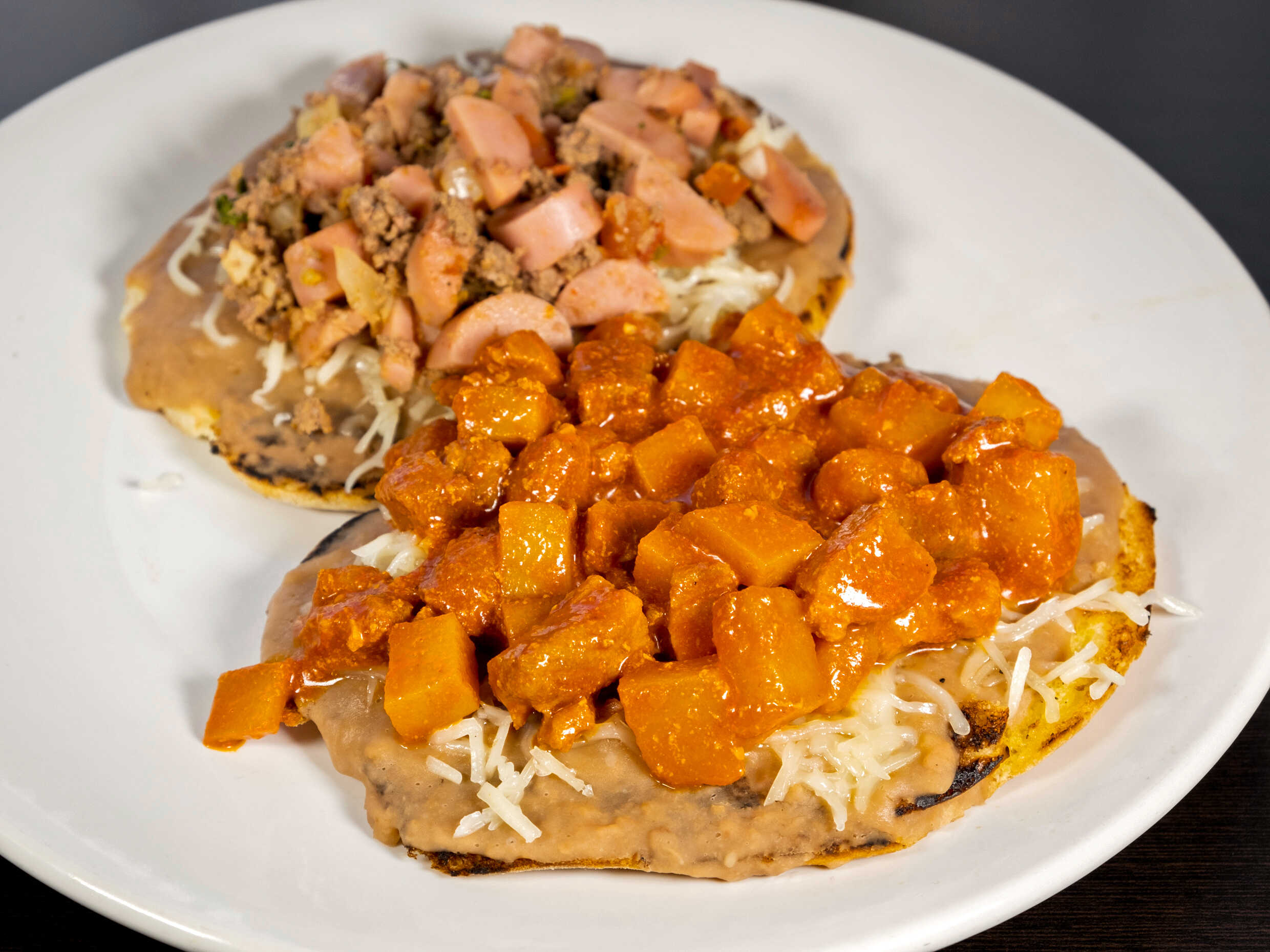 2 Molletes, pan de blanco tostado con mantequilla cubierto de Frijoles y queso blanco, guisos a escoger, bebidas de355ml
