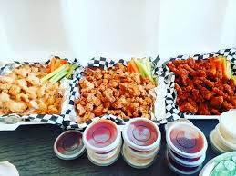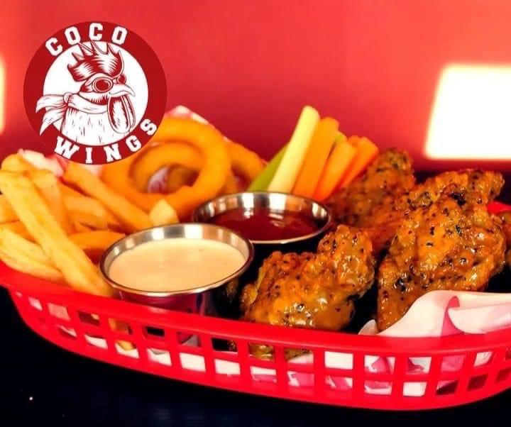 1 1/2 kg de bonelees o alitas, una orden papas, una orden de aros de cebolla, aderezo y verdura