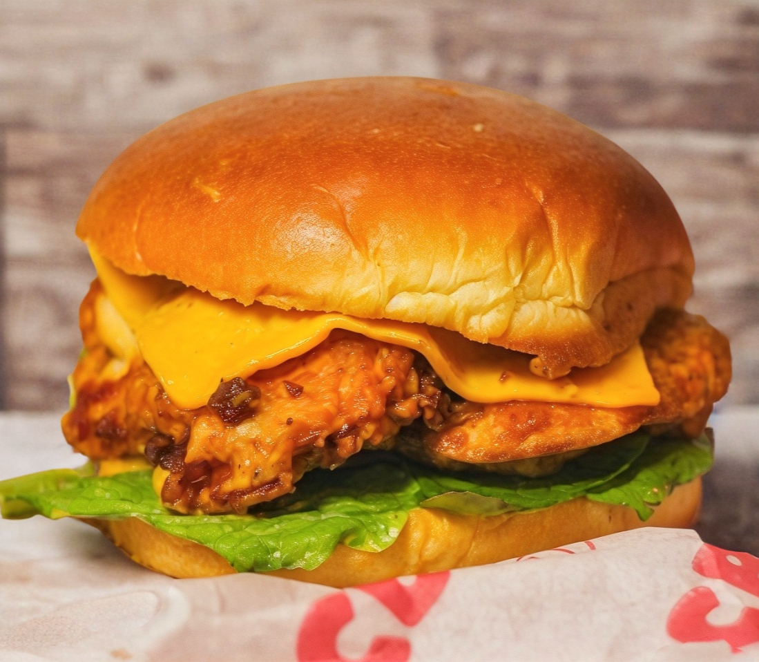 Carne de res, queso amarillo empanizado, aderezo colina, lechuga, tomate, tomate, cebolla y pepinillos.