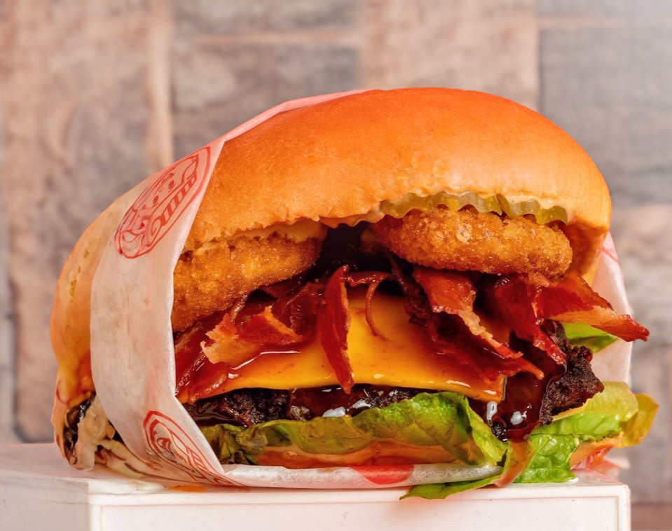Carne de res, queso americano, aderezo BBQ, aros de cebolla, tocino, pepinillos.