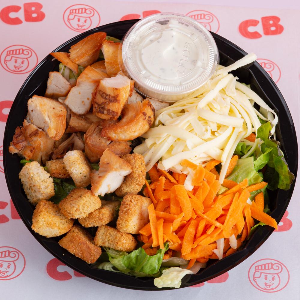 Lechuga con zanahoria, arándanos, queso, pollo acompañada de crutones, ranch y vinagreta