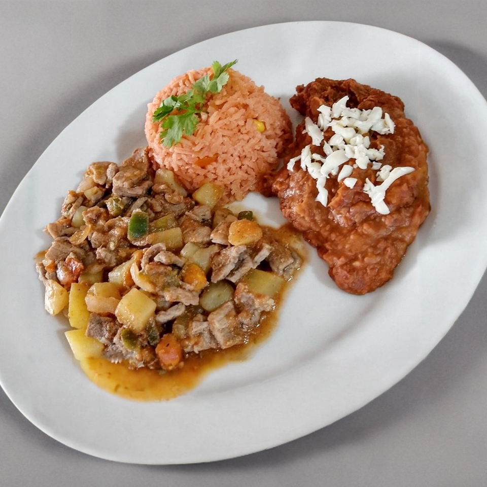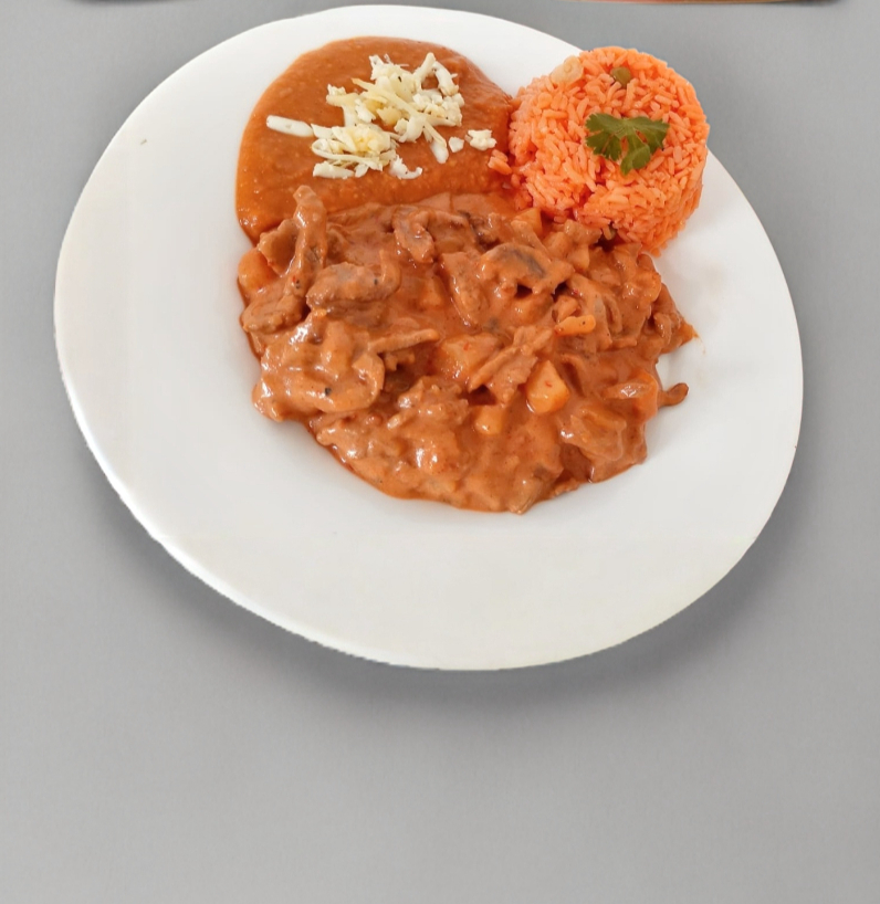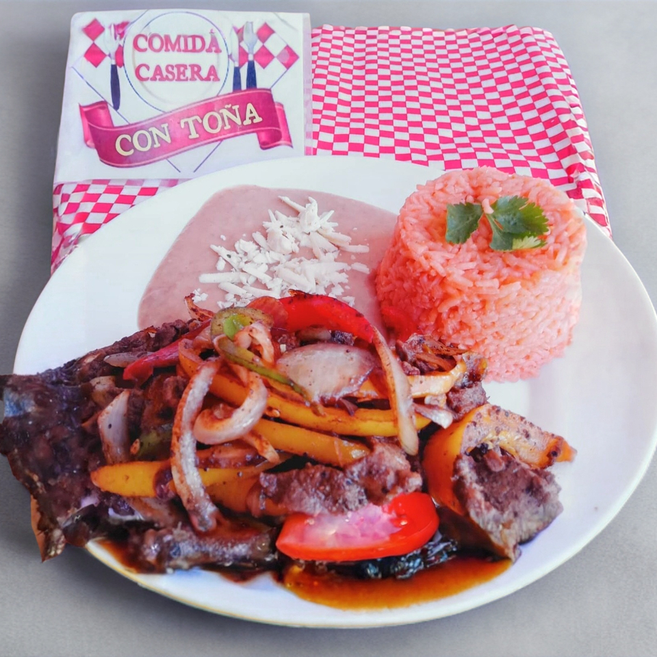 Carne de res con morrón, cebolla y tomate, acompañado de arroz, frijoles refritos y Tortillas.