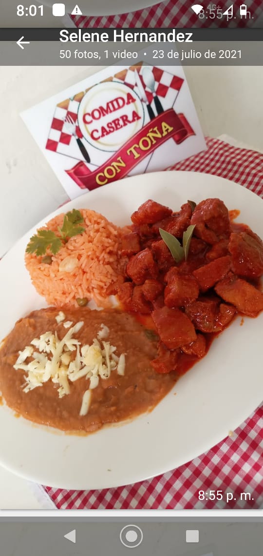 Carne de res con Papas Bañadas en salsa de Chipotle y crema, Acompañados de arroz,Frijoles y Tortillas