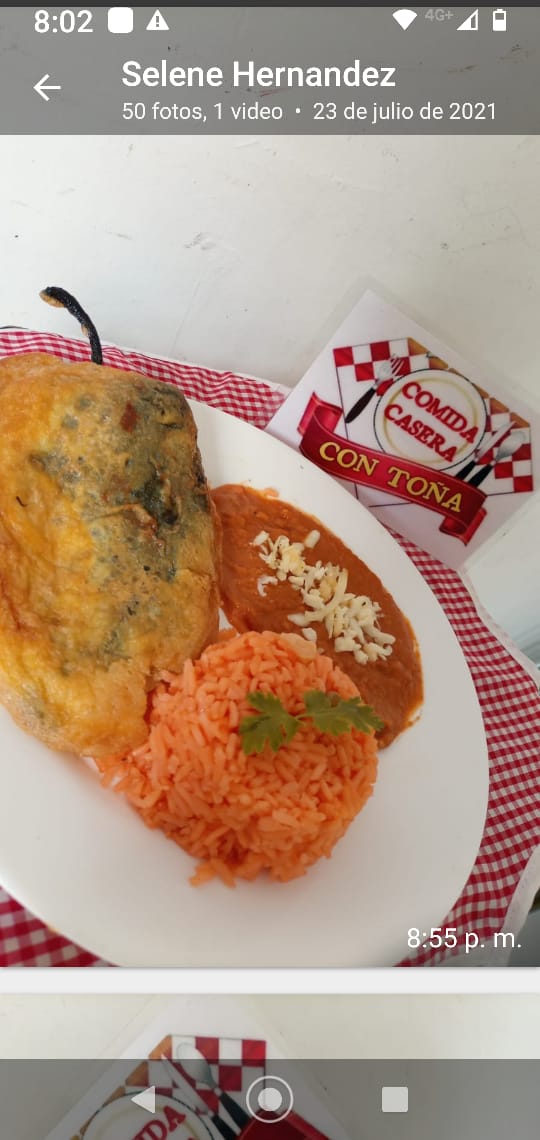 Chile Relleno de queso lampreado con huevo acompañado de arroz y frijoles refritos.