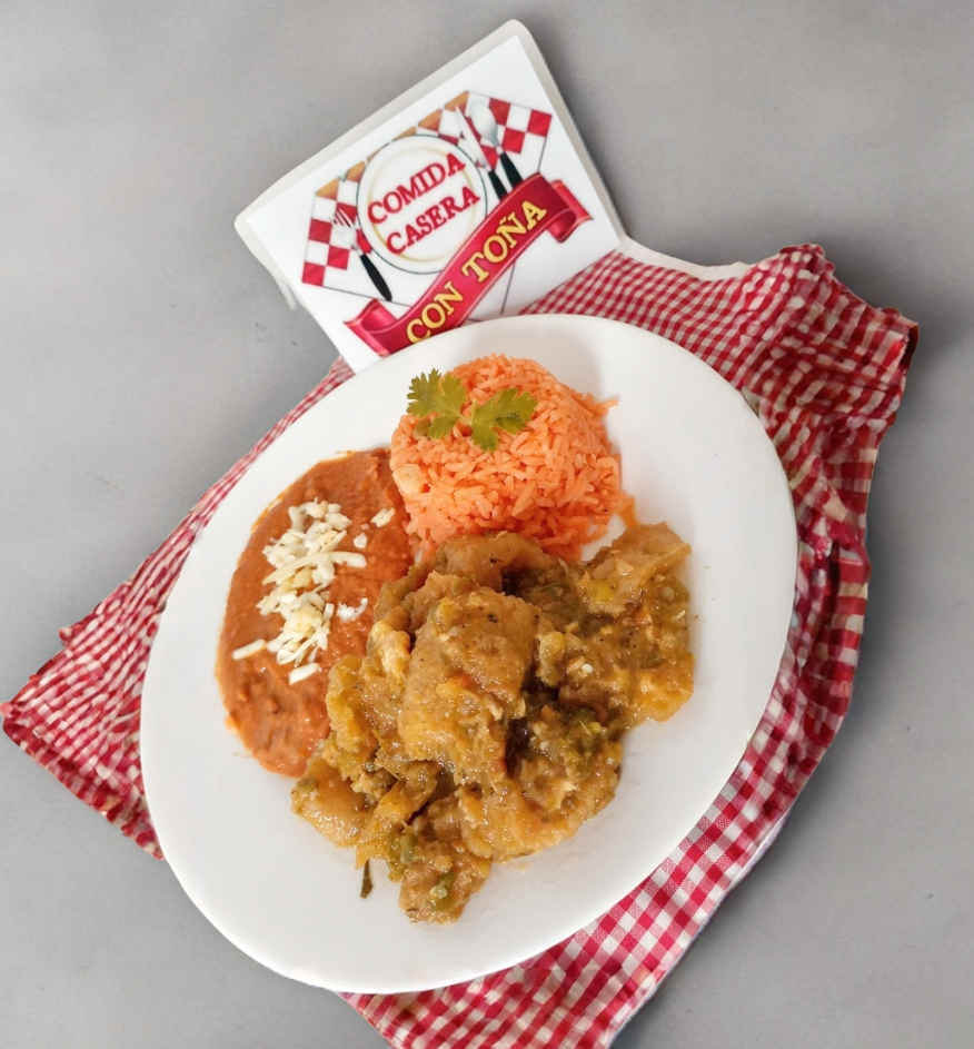 Chicharron en salsa verde, Acompañado de Arroz, Frijoles y Tortillas.