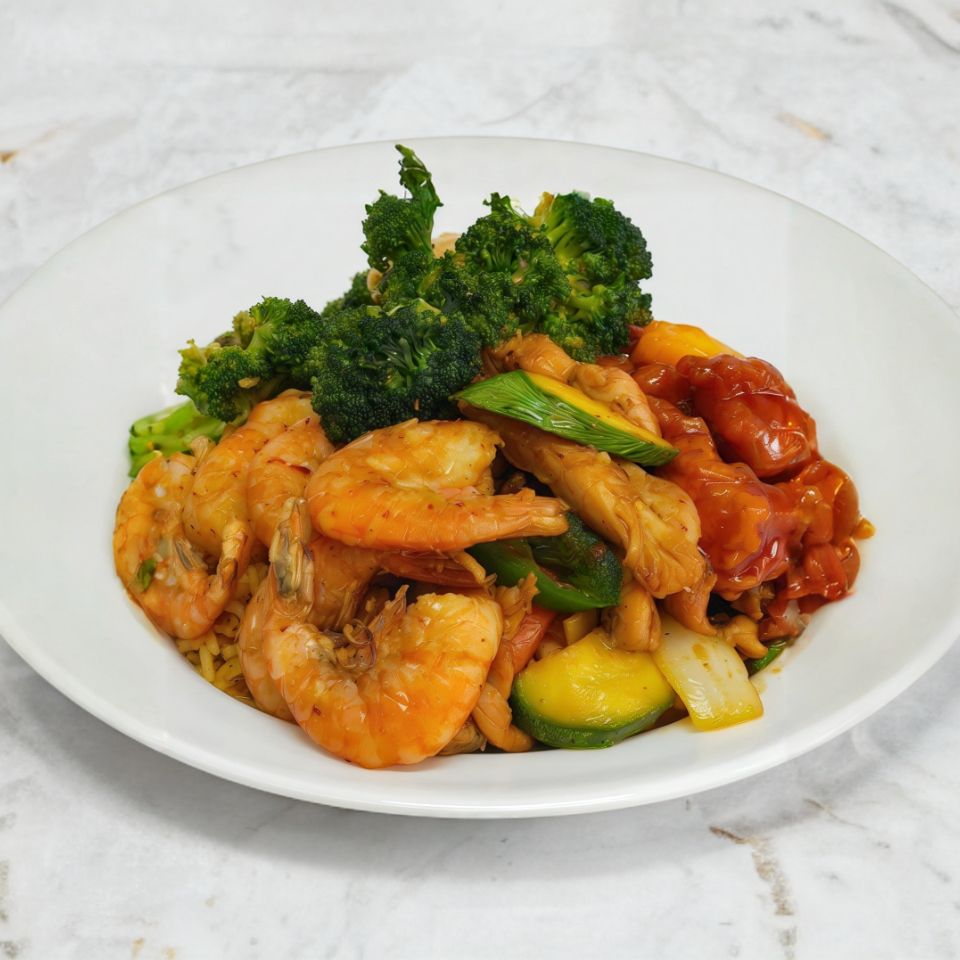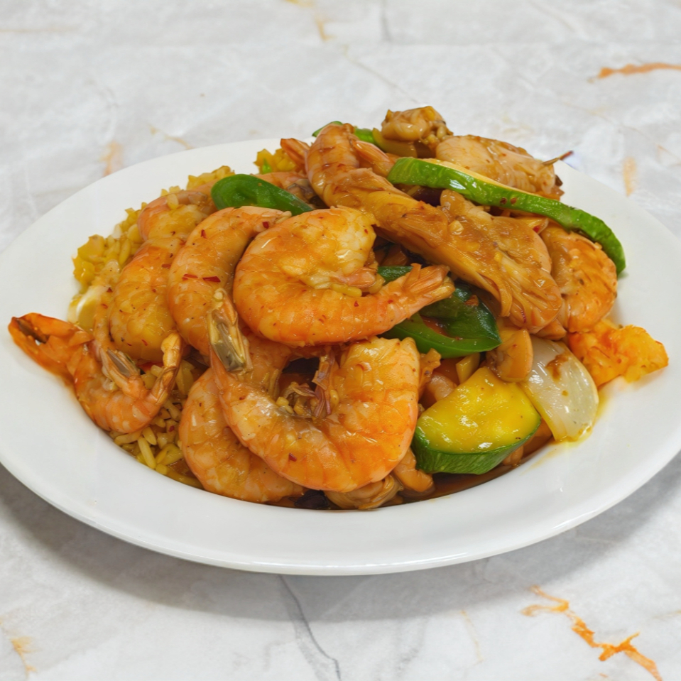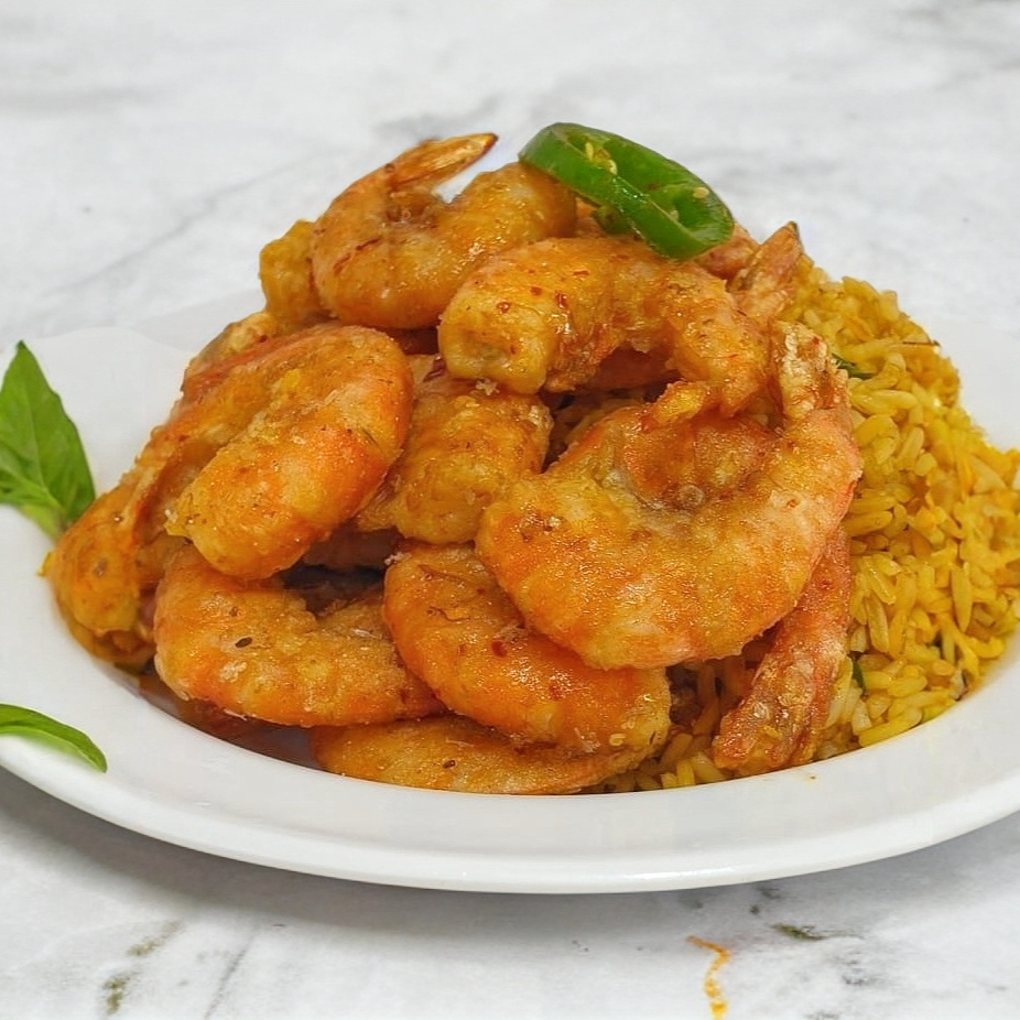 Charola grande con porción de camarón.