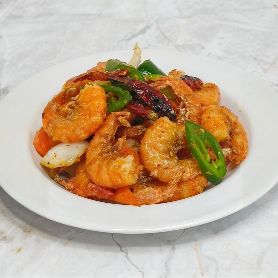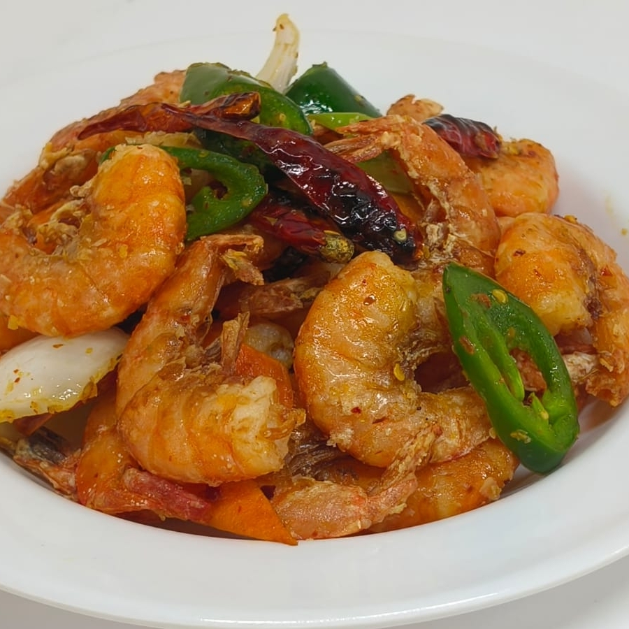Charola chica con porción de camarón.