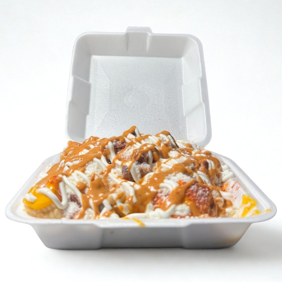 Maruchan de medio litro sobre una cama de papitas con queso amarillo y elote, mantequilla, crema, queso en polvo, chile en polvo, Salsa maggie, salsa valentina, y aderezo de la casa a eleccion.