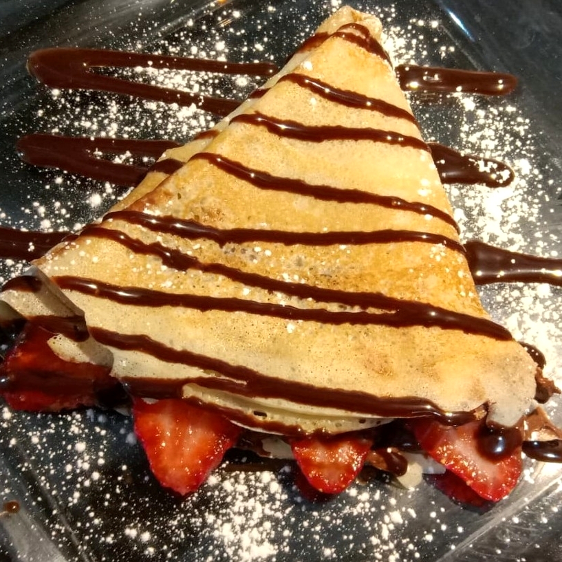 Tortita fina de harina rellena de crema de avellanas con fresas picadas. Decorada con lechera o chocolate.