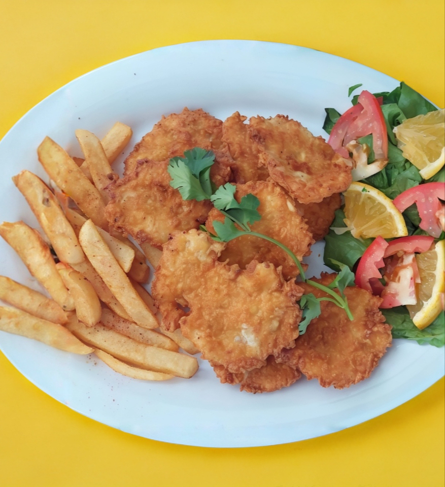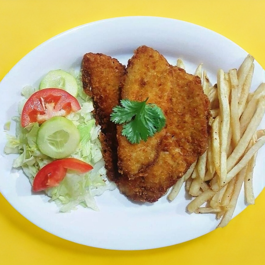 FILETE EMPANIZADO, ACOMPAÑADOS DE PAPAS Y ENSALADA.