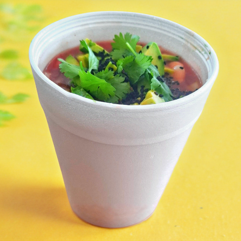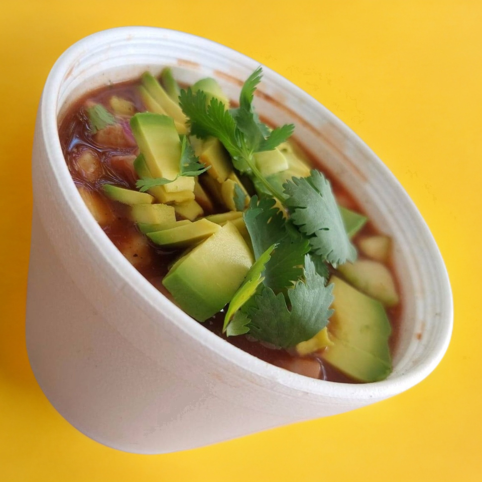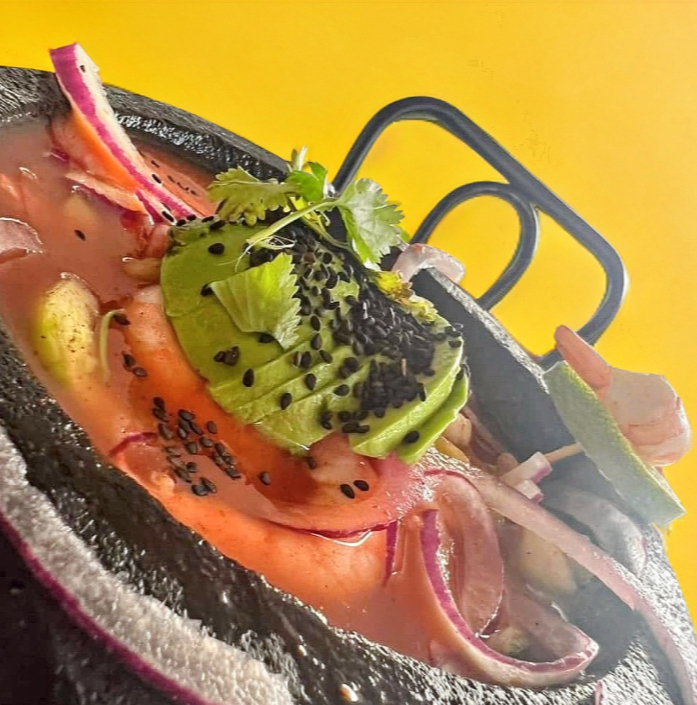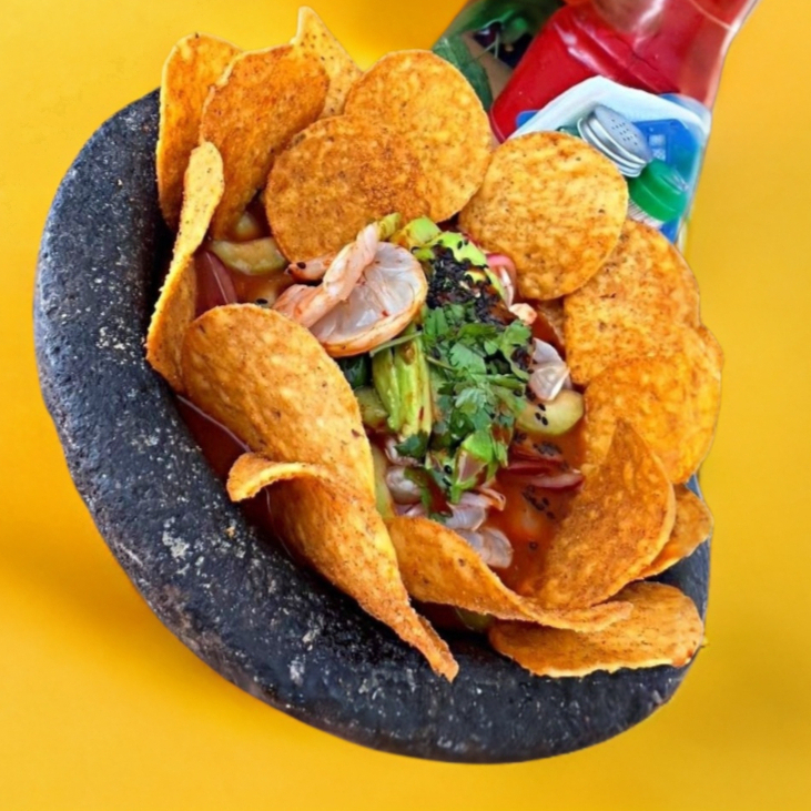 CAMARONES, PEPINO, CEBOLLA MORADA, AGUACATE Y TOSTITOS.