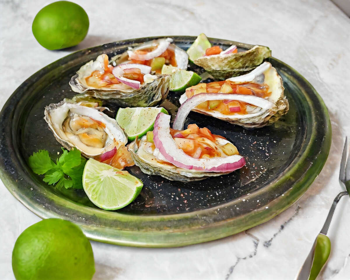 6 OSTIONES EN SU CONCHA PREPARADOS CON SALSAS NEGRA Y CAMARÓN.