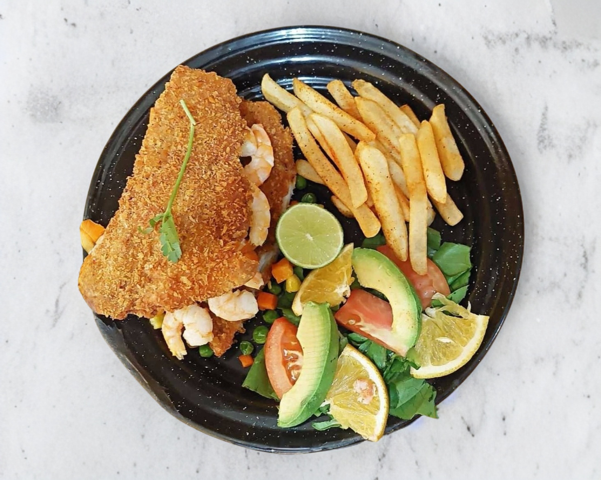 FILETE EMPANIZADO RELLENO DE CAMARONES, ACOMPAÑADOS DE PAPAS Y ENSALADA.