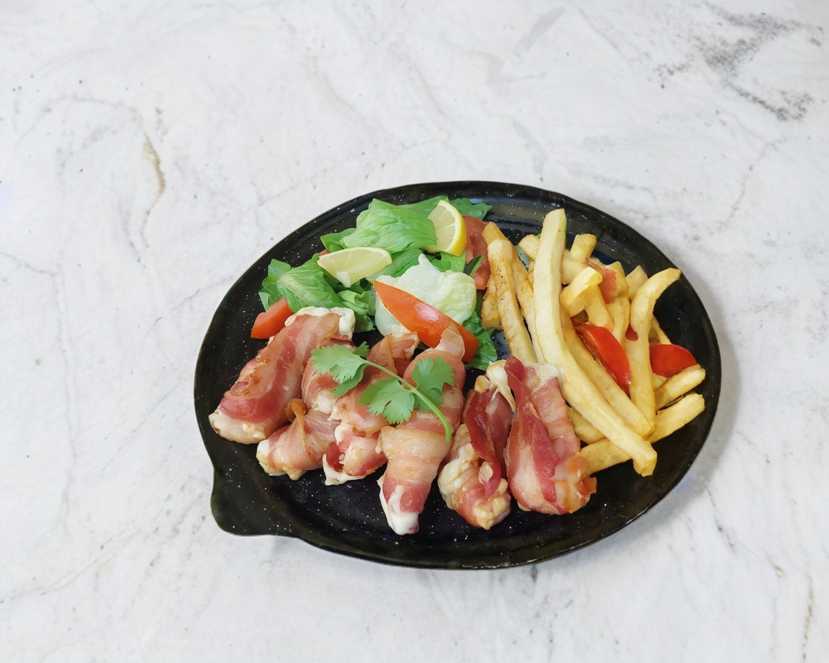 CAMARONES ENVUELTOS EN TOCINO, RELLENOS DE QUESO, ACOMPAÑADOS DE PAPAS Y ENSALADA.