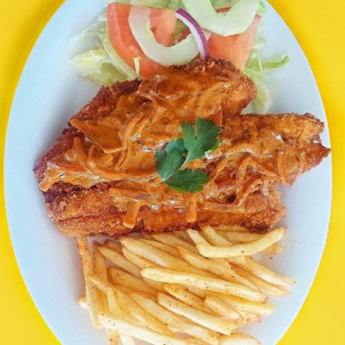 FILETE EMPANIZADO BAÑADO EN SALSA CHIPOTLE, ACOMPAÑADOS DE PAPAS Y ENSALADA.