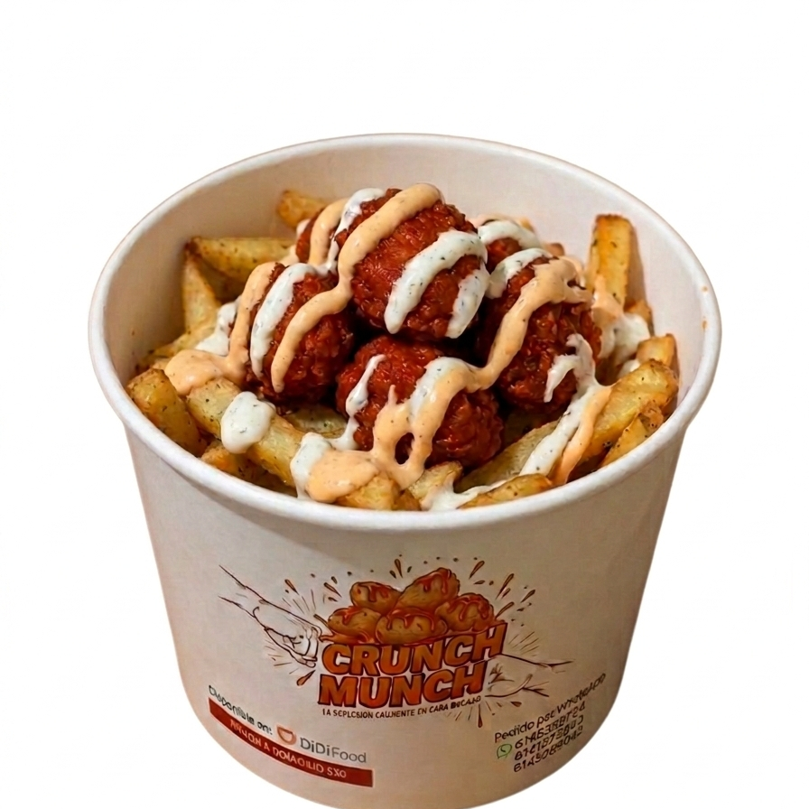 250 gr de papas cubiertas con 150 gr de boneless bañados en tu salsa favorita, por ultimo un toque de nuestro aderezo especial con deliciosa ranch