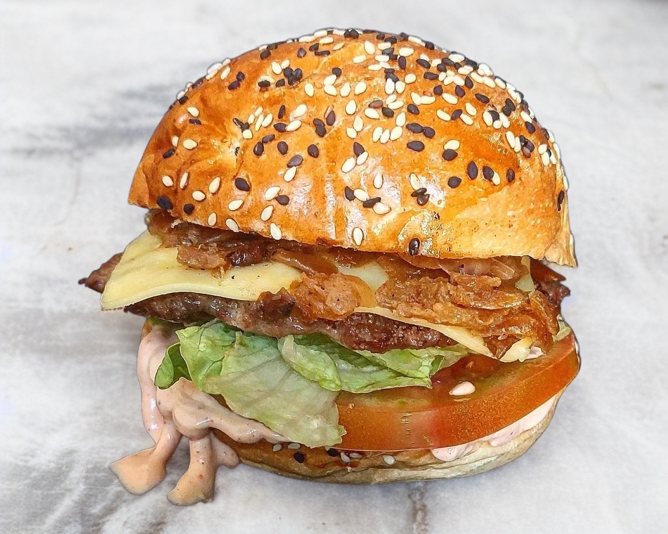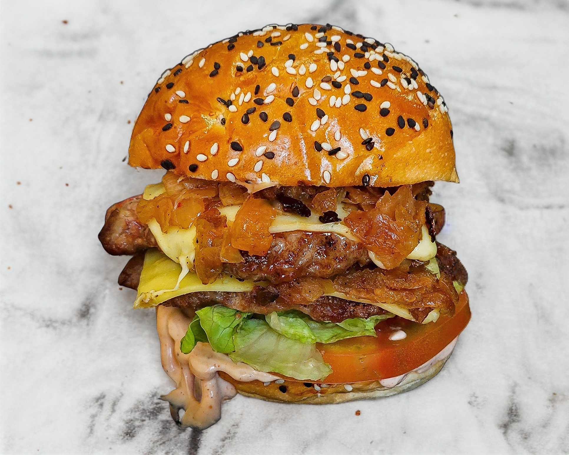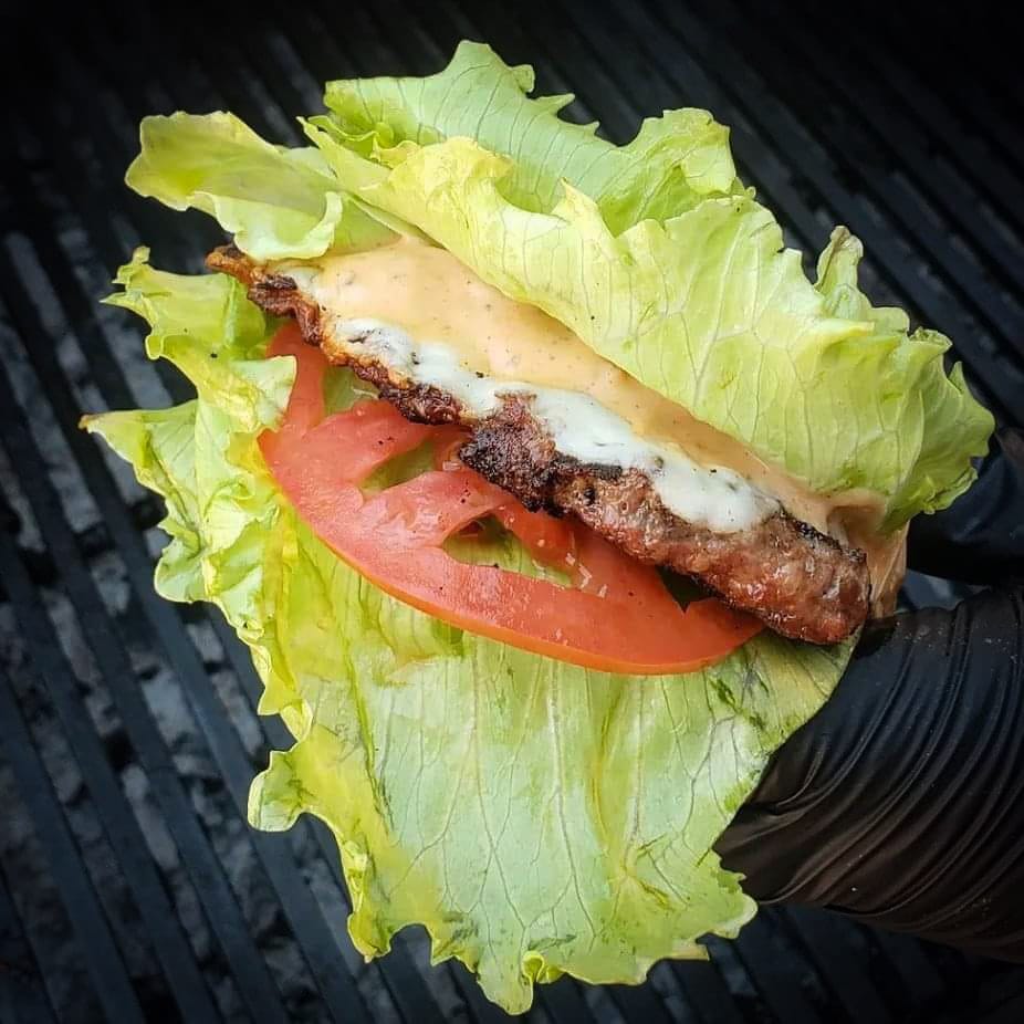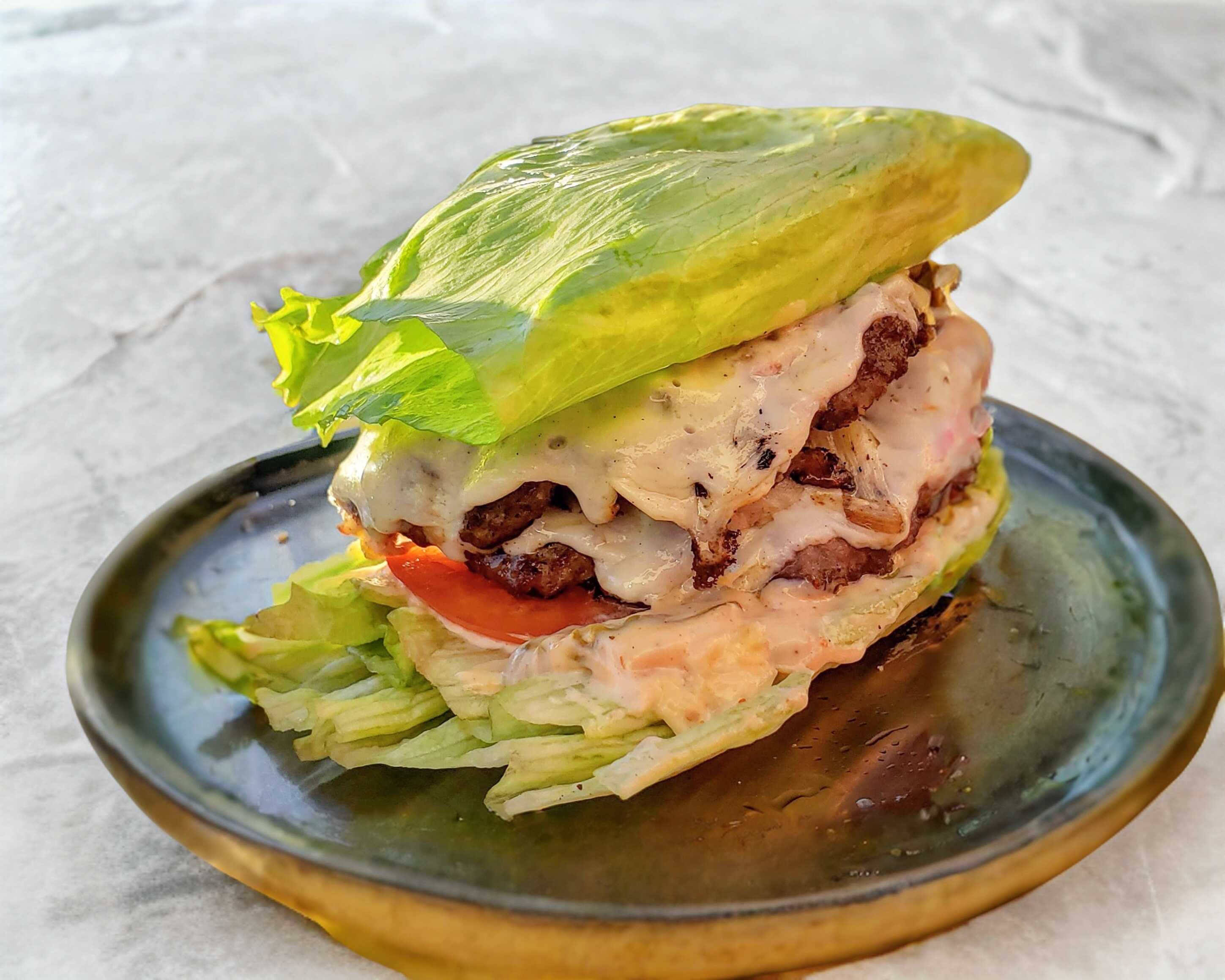 Deliciosa hamburguesa de doble carne TOP-SIRLOIN, queso Chihuahua, cebollita caramelizada, tomate y aderezo de la casa, todo envuelto en lechuga fresca y crujiente.