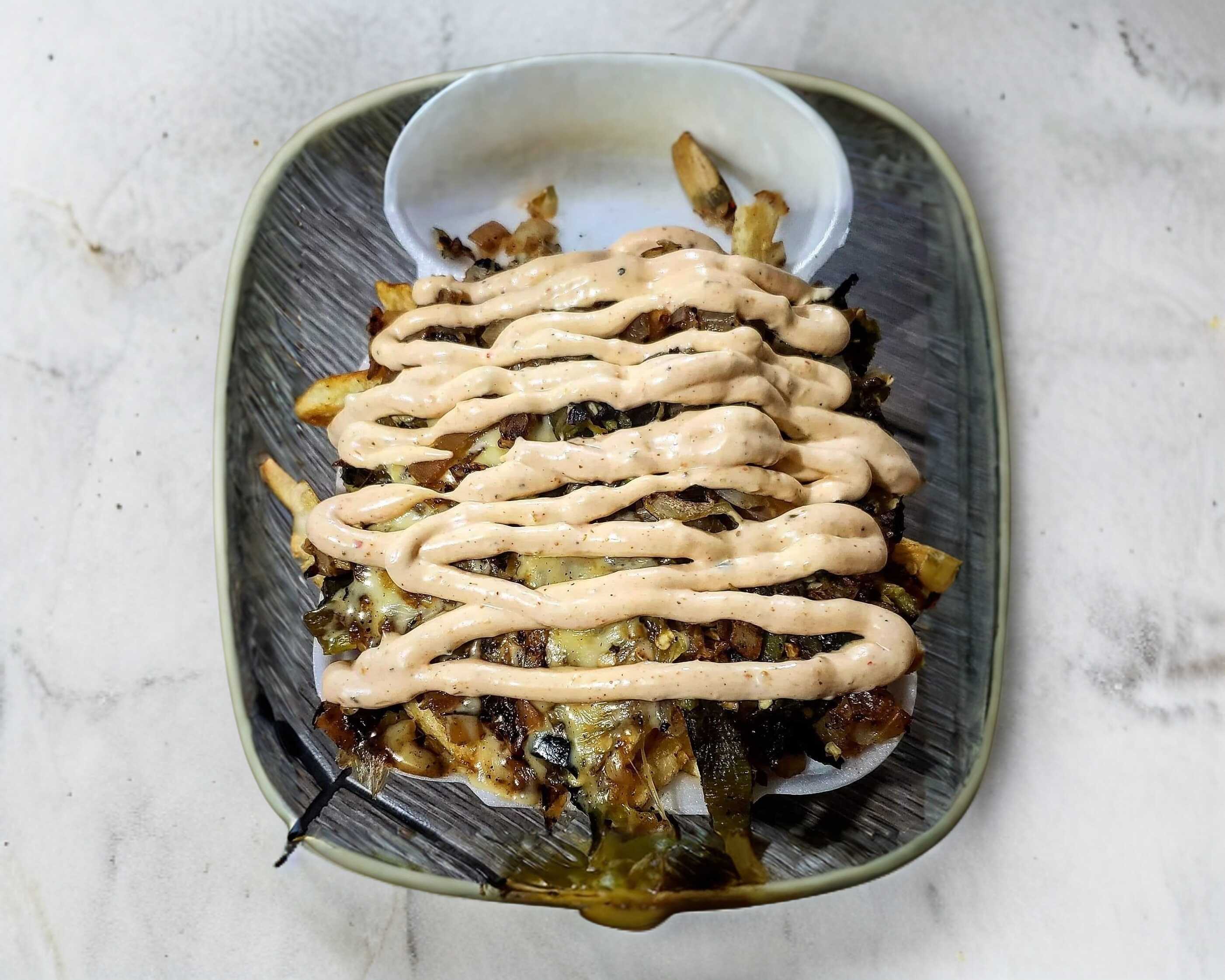 Papas naturales, cortadas al día. Bajo una cama de queso gratinado, cebollita caramelizada y chile toreado. Todo esto bañado de nuestro aderezo de la casa.