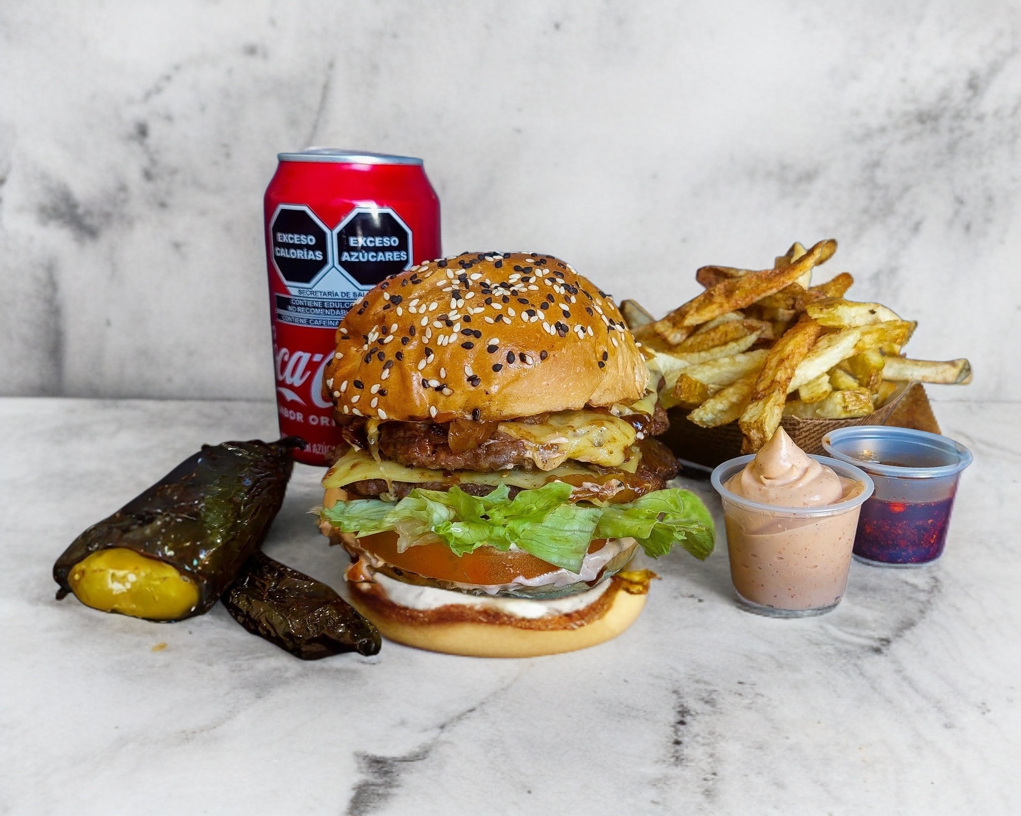 Deliciosa hamburguesa con pan Brioche, doble carnita TOP-SIRLOIN, queso Chihuahua, cebollita caramelizada, lechuga fresca, tomate y nuestro riquísimo aderezo de la casa. Acompañada de un side de papas francesas y refresco.