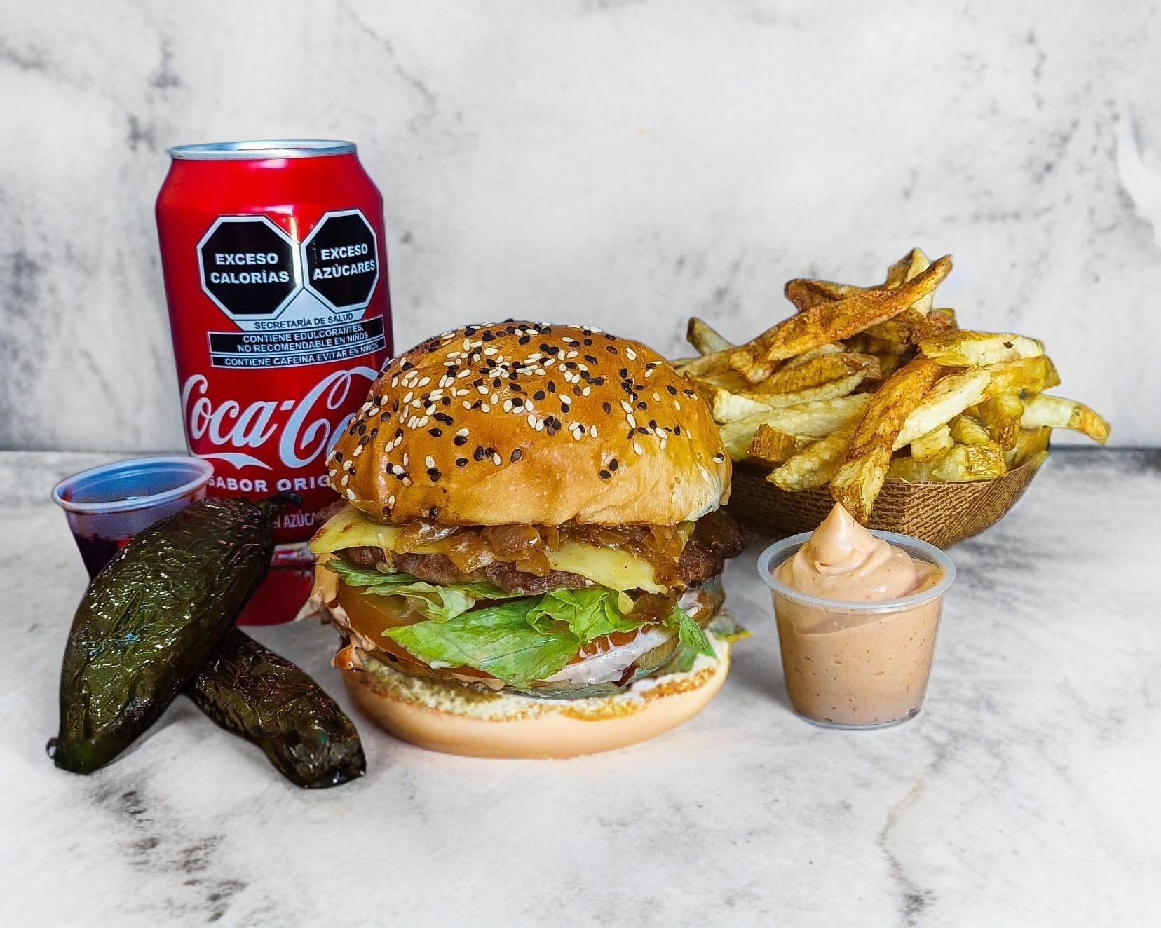 Deliciosa hamburguesa con pan Brioche, doble carnita TOP-SIRLOIN, crujiente tocino, queso Chihuahua, cebollita caramelizada, tomate, todo bañado en una riquísima salsa sweet BBQ de chile pasado y nuestro aderezo de la casa. Acompañada de un side de papas francesas y refresco.