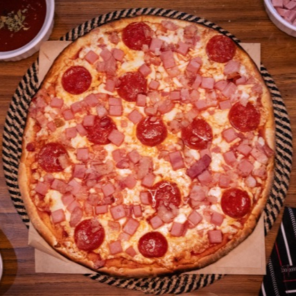 Especialidad de la casa; peperoni, jamón y tocino.base con salsa de la casa y queso menonita.
