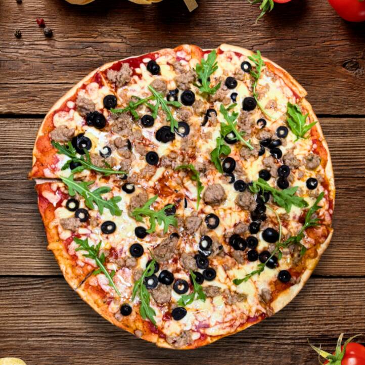 Salchicha italiana, aceitunas, vinagre balsámico y arúgula.base con salsa de la casa y queso menonita.