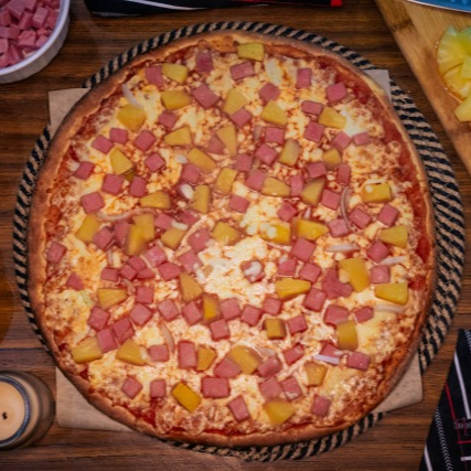 Para los amantes del jamón y la piña. base con salsa de la casa y queso menonita.