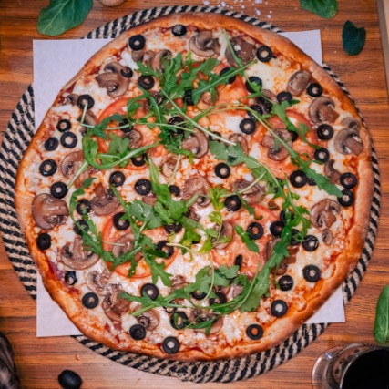 Rodajas de tomate, aceituna negra en rodajas, champiñones rebanados, coronado con arúgula y aceite de olivo.