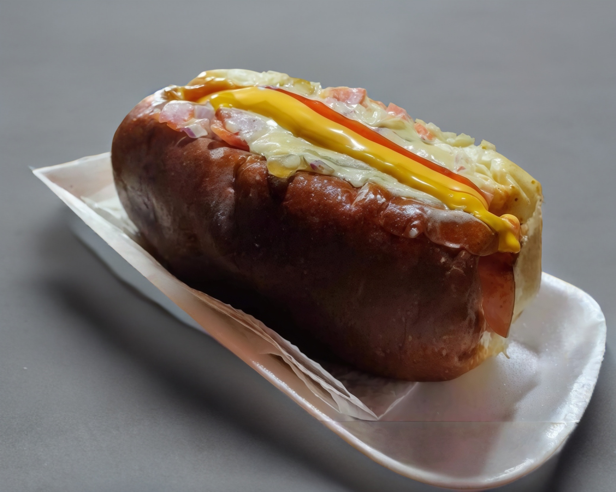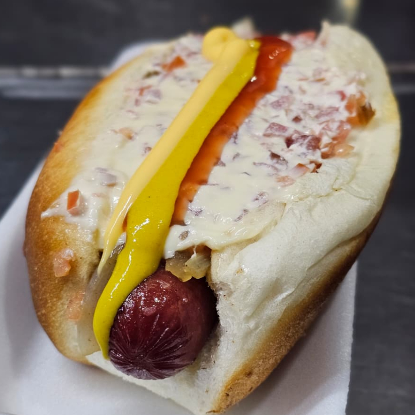 Salchicha con queso, jamón, pepperoni, salsa de tomate y doble tocino, incluye cebolla guisada, cebolla cruda, tomate mayonesa y cátsup.