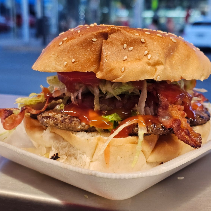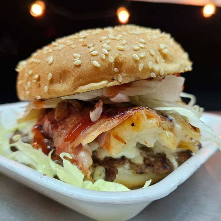 Carne de res, mitad de una salchicha con tocino, lechuga, tomate queso y aderezos.