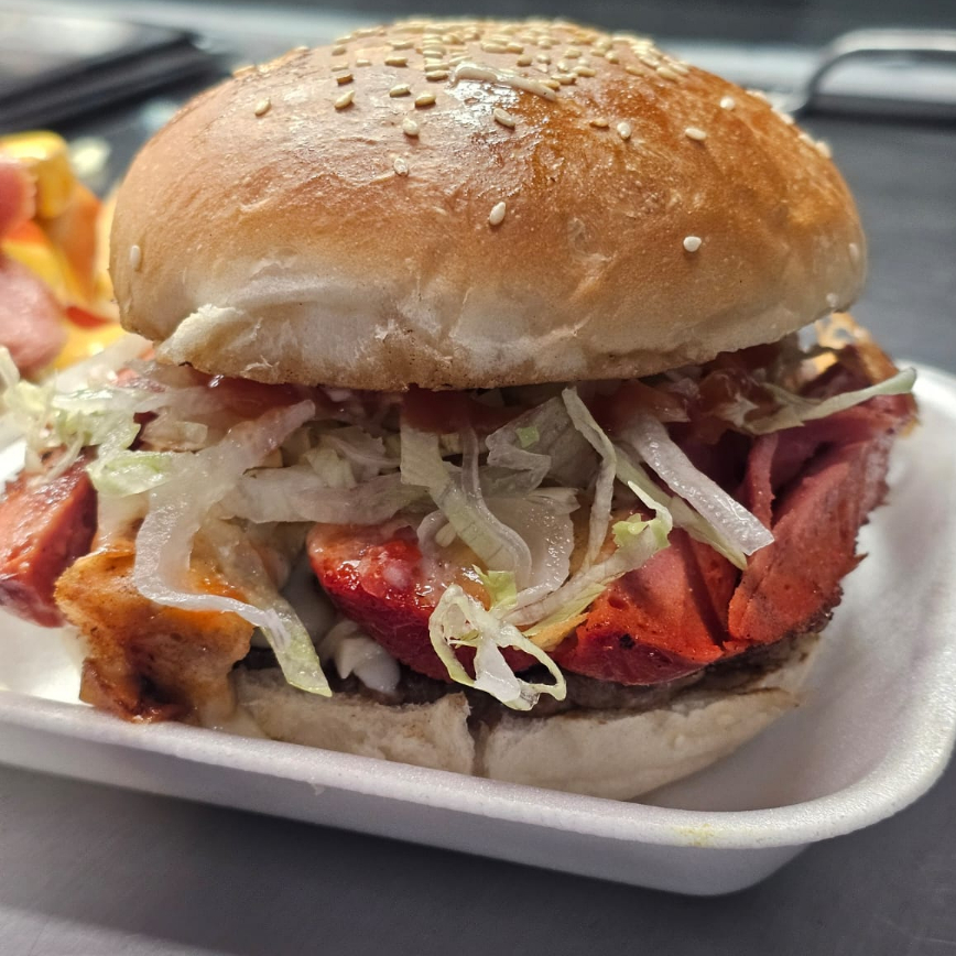 (Pan, carne de res, mitad de salchicha. tocino, queso, lechuga, tomate, mayonesa, mostaza y cátsup)