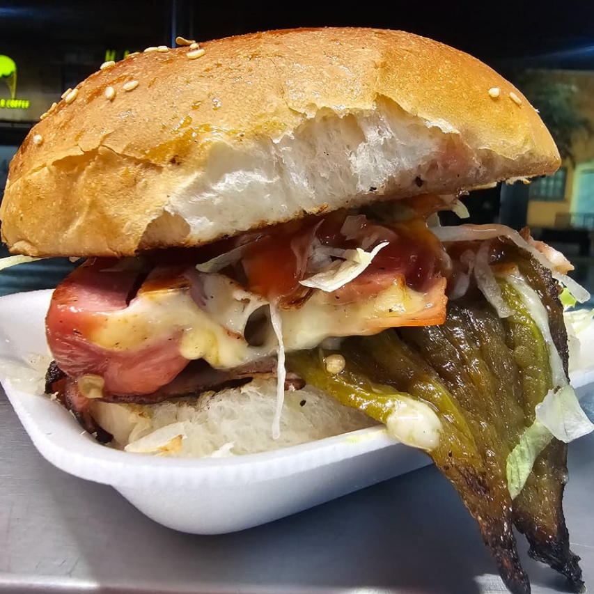 (Pan, carne de res, rollo de jamón con camarón, queso, lechuga, tomate, mayonesa, mostaza y cátsup)