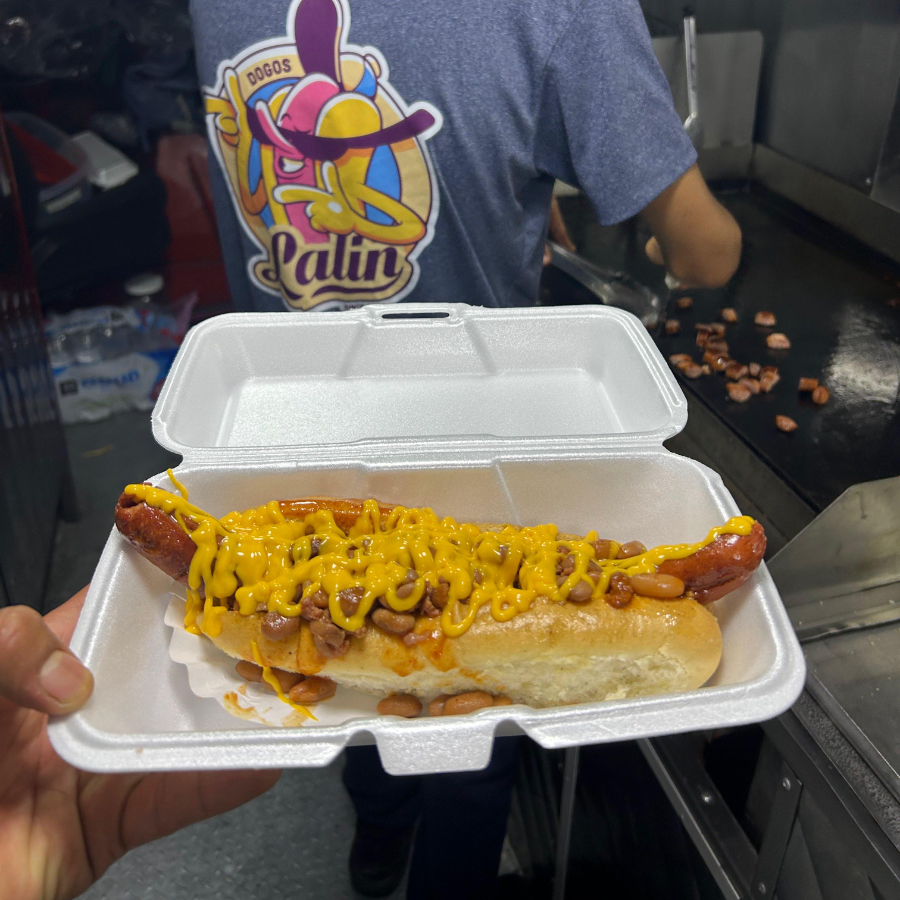 Pan Artesanal, (1 Salchicha de Pavo Envuelta en Tocino) Frijoles, Tomate, Cebolla, Mayonesa, Cátsup, Mostaza, Queso Amarillo, aderezoDogoslalin(Receta secreta)