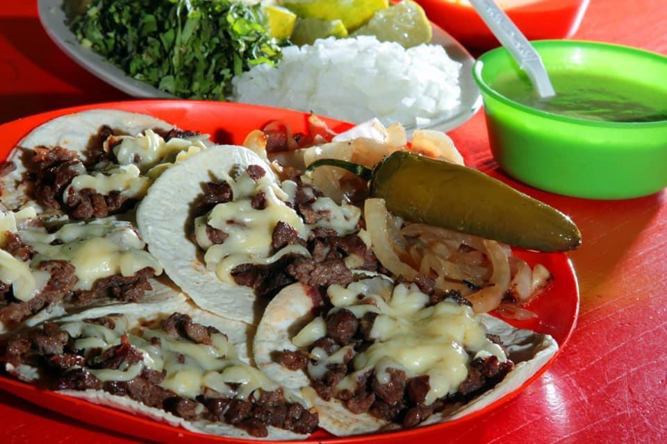 5 Tacos al pastor con queso fundido.