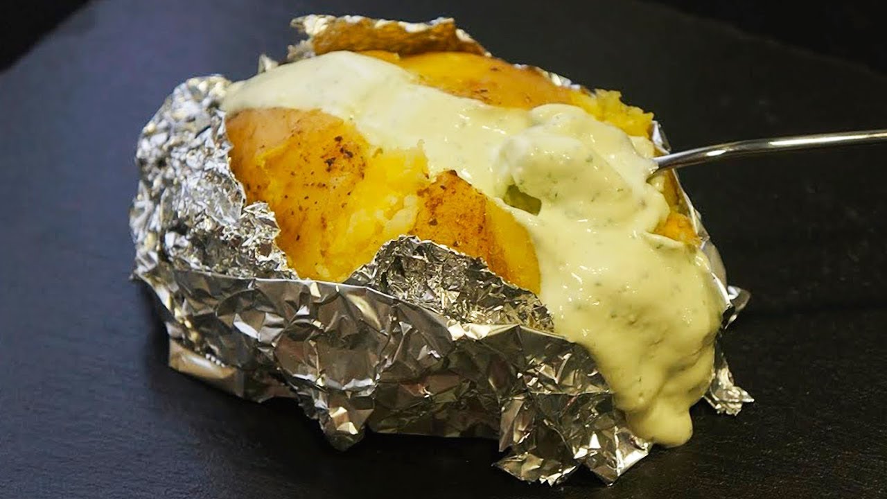 Papa Asada con Queso y Mantequilla. Incluye salsas