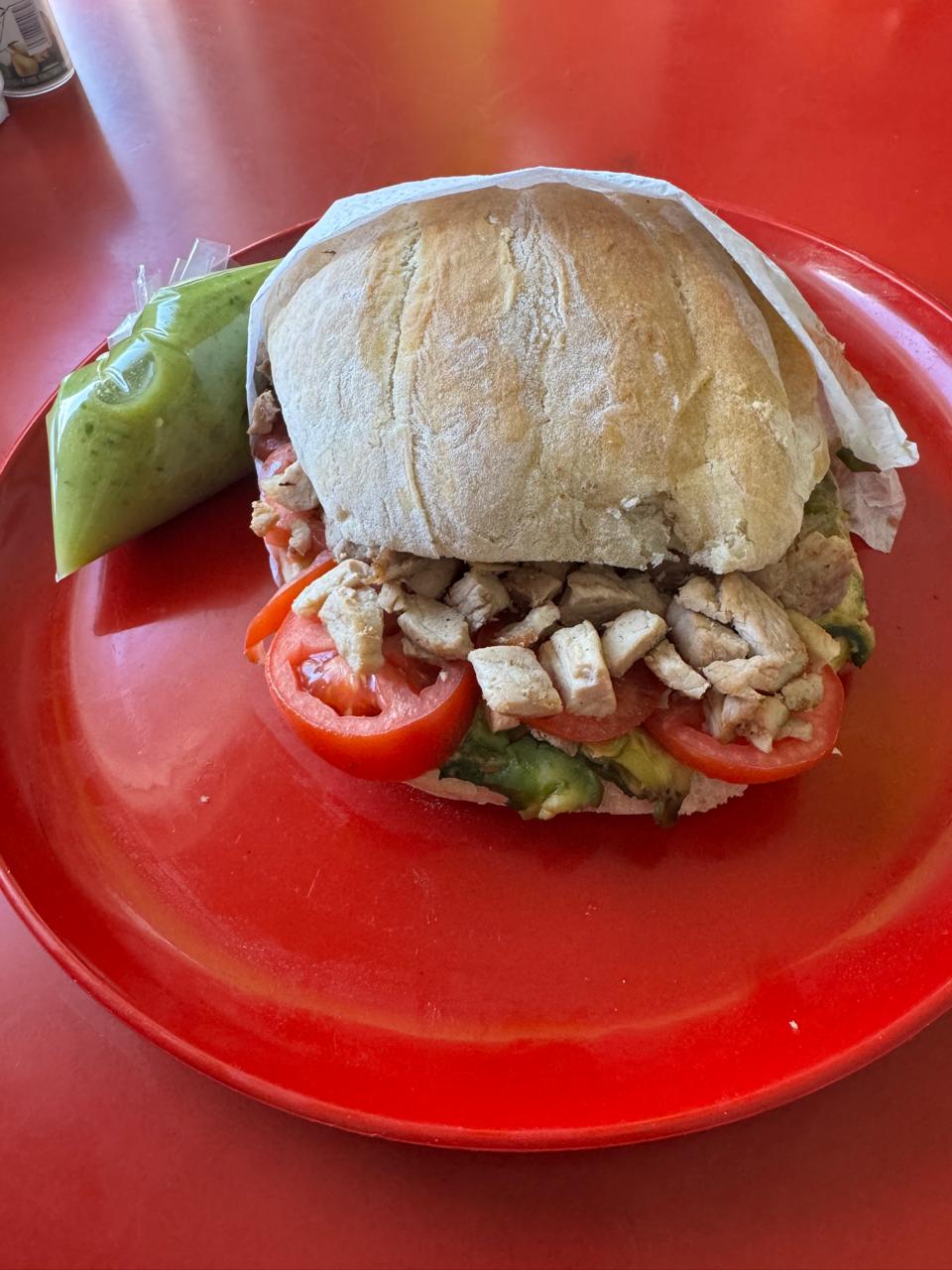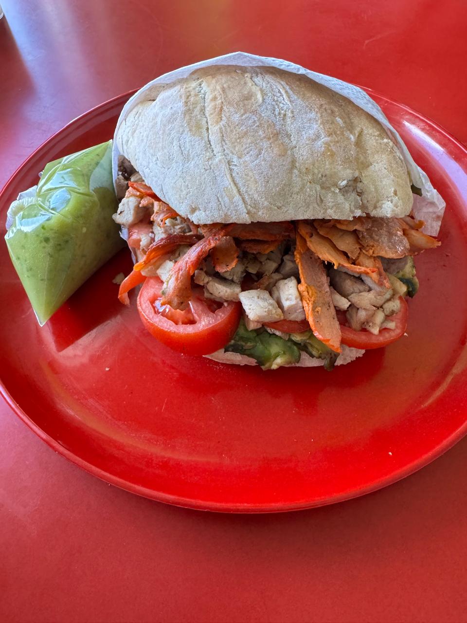 Torta de Pastor con aguacate, queso, tomate y mayonesa. Incluye salsa