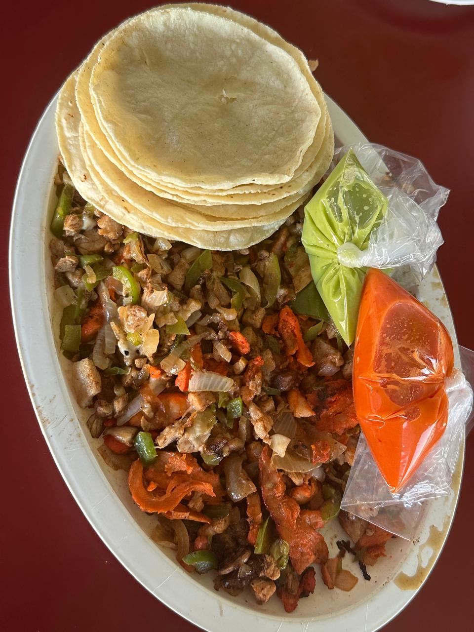 porción de Chuleta, morron, cebolla, tomate y queso. Incluye tortillas, salsas y limones.