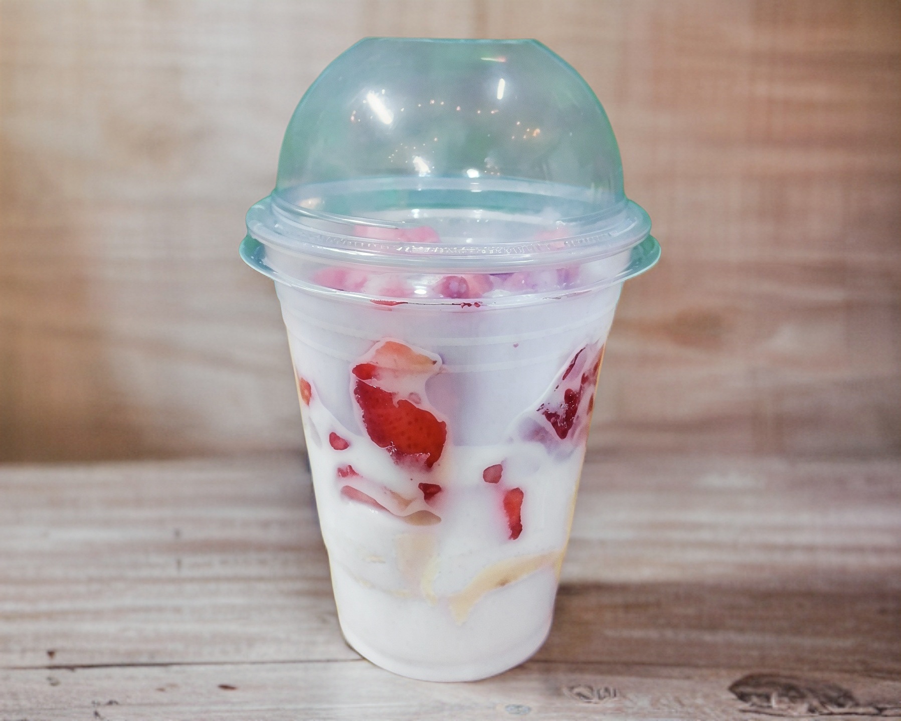 Deliciosa fresa y platano natural con crema, puedes elegir un toping y un jarabe al gusto