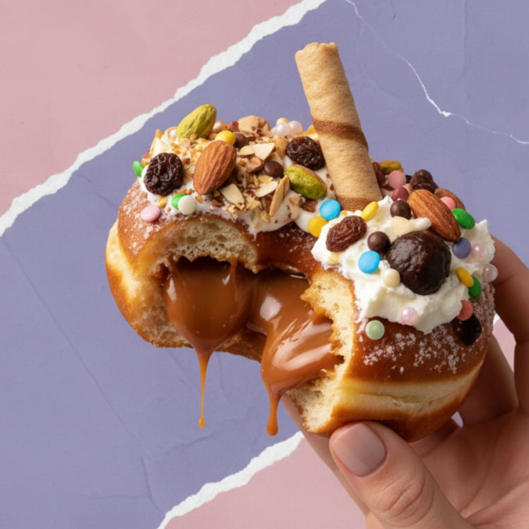 Donas rellenas de aderezo a elegir, contiene wafer stick, nuez, bombón, crema batida, chispas de chocolate de colores, pasas de chocolate y perlas de azúcar