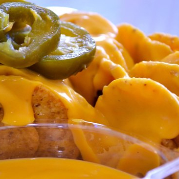 Botana bañada de queso para nachos con topping de crema , jalapeños y queso blanco