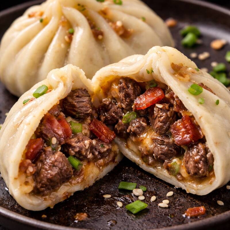 Bistec con tocino. Incluyen salsa soya, salsa macha y crema de chipotle.
