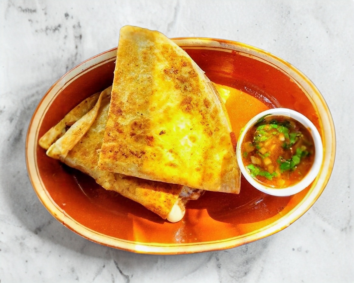 Quesadilla de tortilla de harina de tamaño regular con birria, se acompaña con cebolla con cilantro, limón, salsa y un vasito de consomé de birria