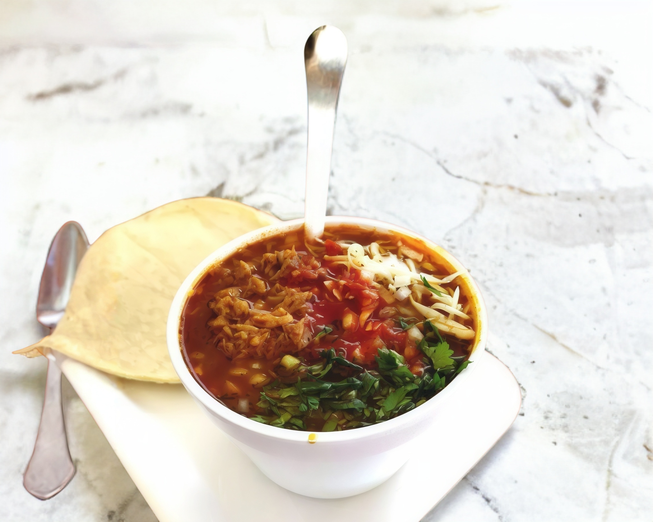 Tortilla de harina jumbo de 32cm con queso y birria, acompañada de cebolla con cilantro, limon, salsa y un vasito de consome