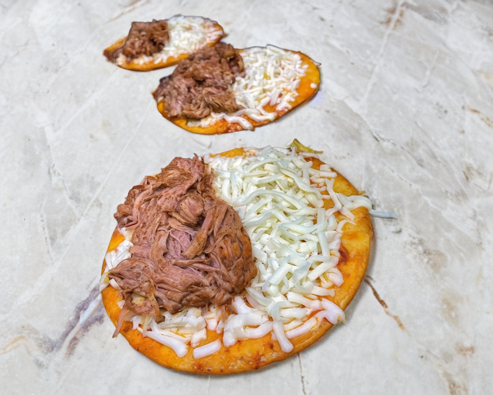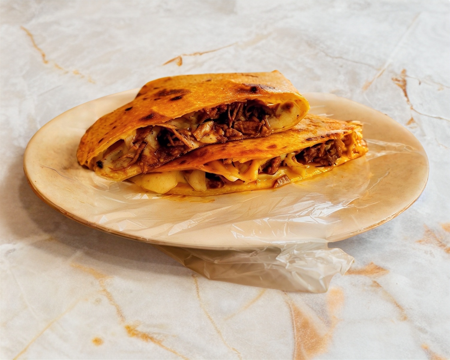 Quesadilla con 2 tortillas de maiz con birria acompañada de cebolla con cilantro y salsa