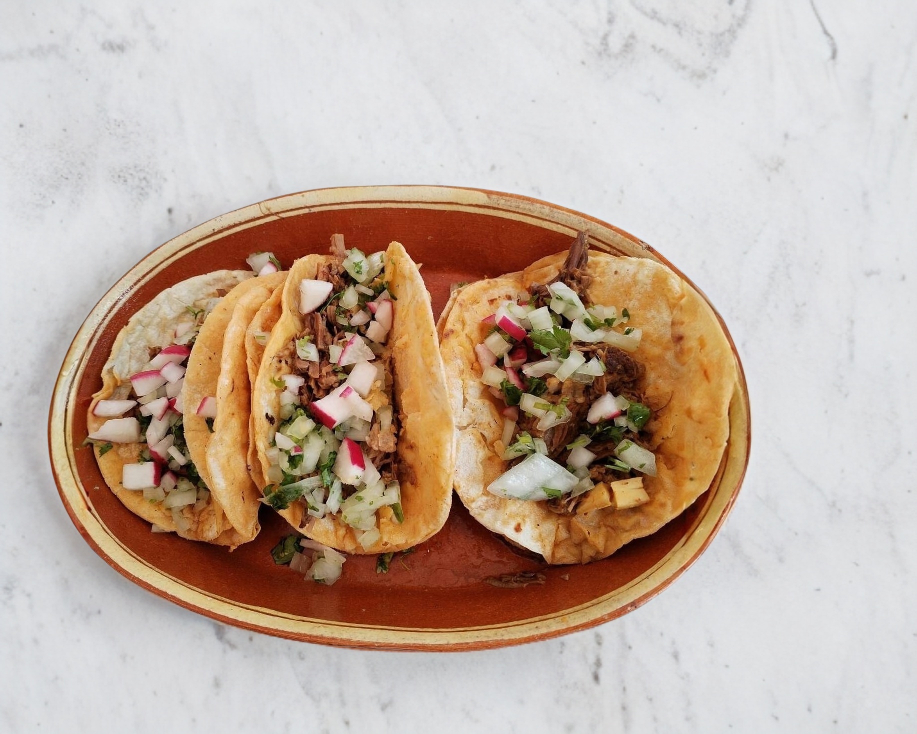 Orden de 4 tacos de Birria con tortilla doble, inluye cebolla con cilantro, limón y salsa.