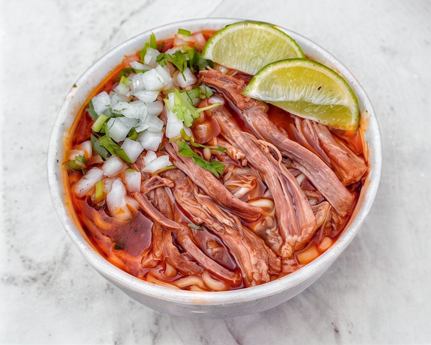 Sopa tipo Ramen servida con birria y consomé de birria, se acompaña con cebolla con cilantro, limón y salsa
