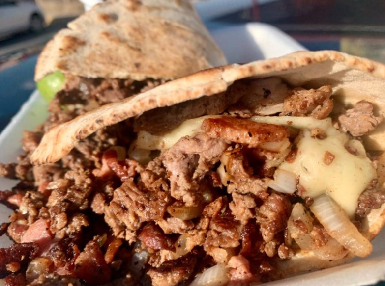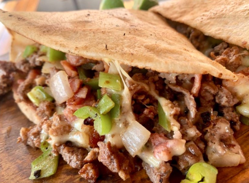 Pan arabe, sirloin asado, tocino, queso cebolla y frijoles.