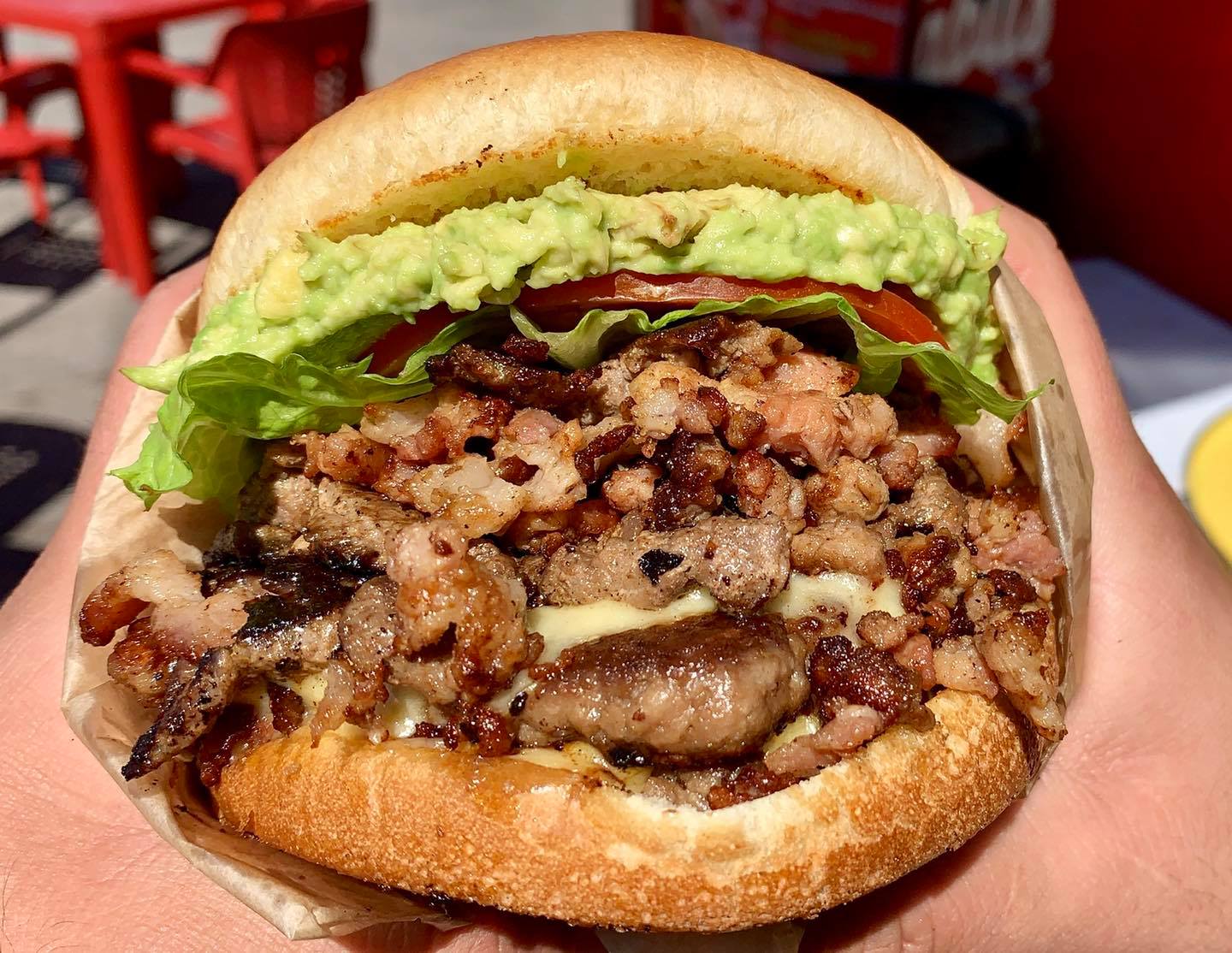 Doble carne, queso, tocino, lechuga, tomate, aguacate, sirloin picado y rib eye.